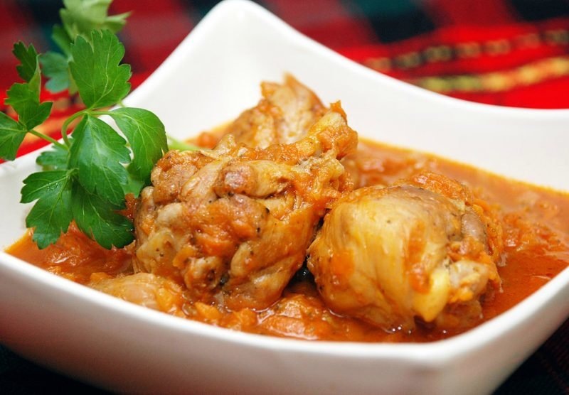 500г жареной птицы, 150г ветчины, 2ст ложки масла, 5 луковицы, 4 бутона гвоздики, 1 ст ложки муки 2 горошек перца, 1 зубчик чеснока, 100 гр печени, 200 гр белых грибов или шампиньонов 2 ст ложки сметаны