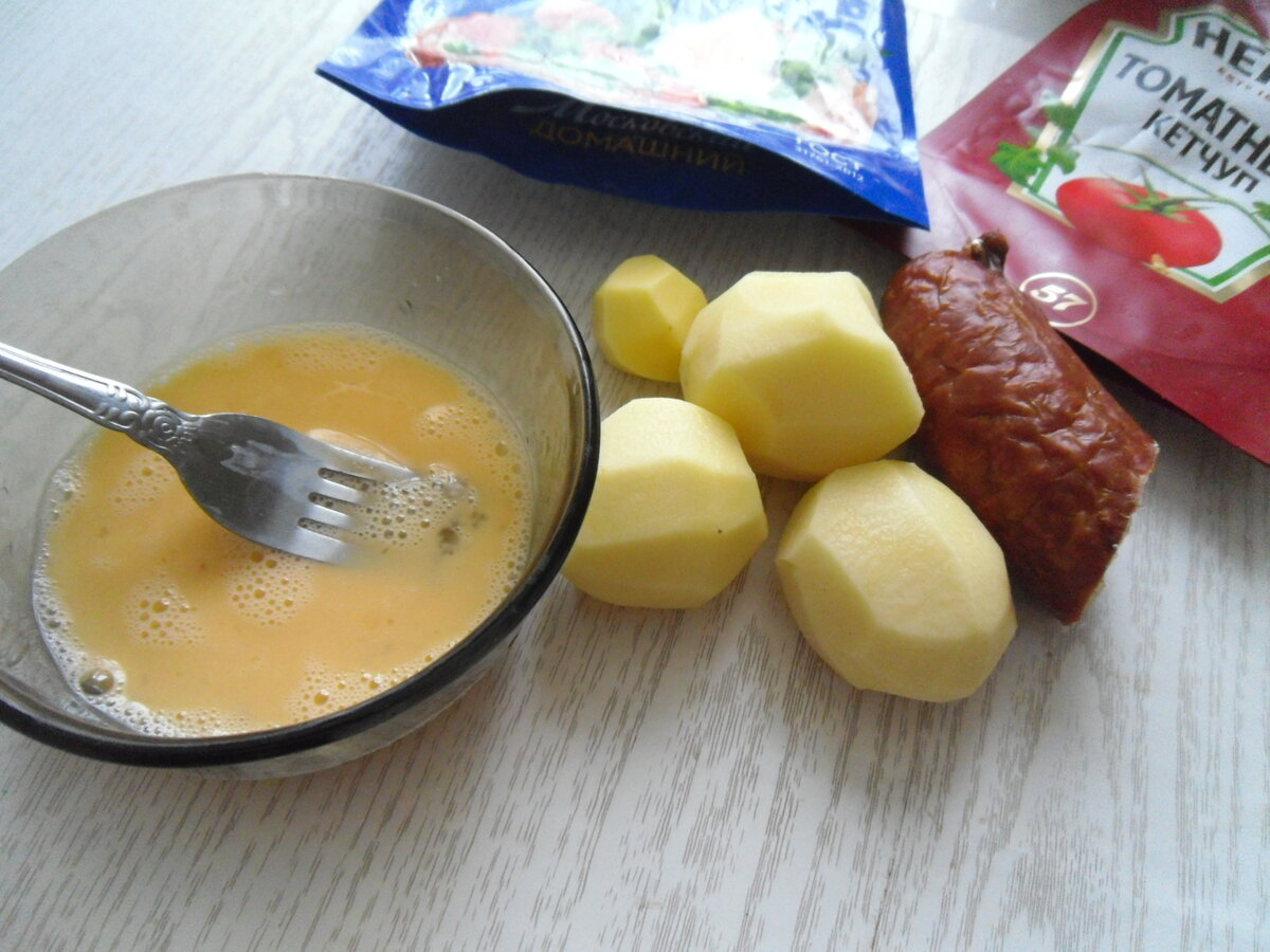 Если у вас есть несколько картошин и сосиска или кусочек колбасы, то можно сделать вот такое простое блюдо.