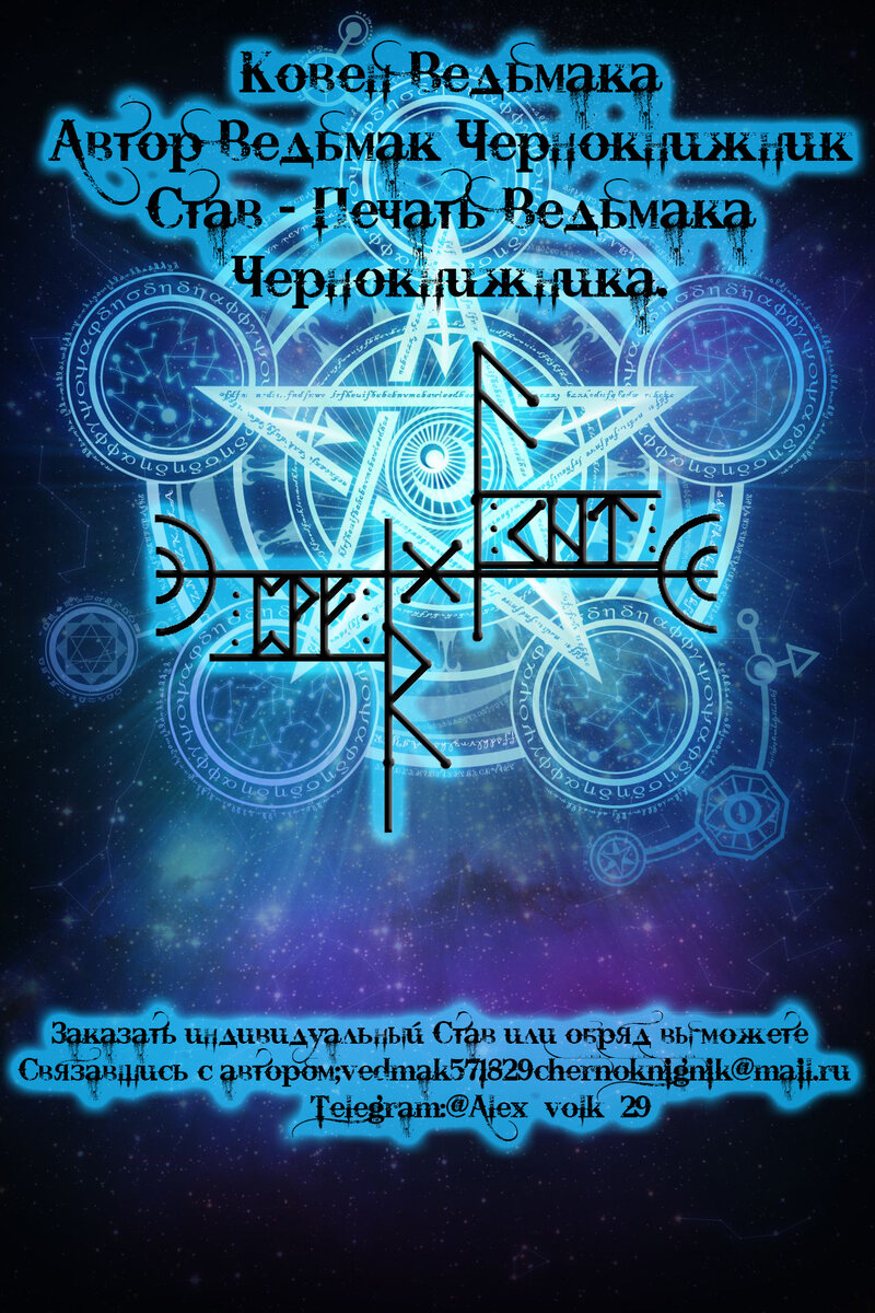 Данный авторский труд запрещается размещать где то либо на форумах или группах, других сайтах без указания авторства и прямой ссылки на источник. Продажа авторских трудов Ведьмака Чернокнижника, а именно ; Рунических Ставов , Гальдраставов, и других вязей и авторских символов запрещена. Так как все авторские труды выкладываемые в сообществе бесплатные. За плагиат и нарушения правил последует немедленное и жестокое наказание.
