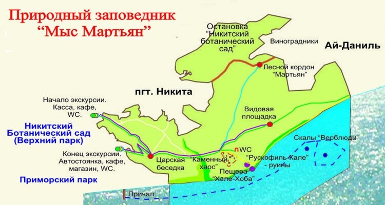 Заповедник Мыс Мартьян предлагает вам также исследовать нижнюю половину описываемого склона. Лес сменяется навалами щебня, а рядом – «каменным хаосом» (природным лабиринтом из накиданных как попало громадных глыб). На самой кромке крохотный помост. В самой же в воде вам встретятся 4 горбатых островка-рифа. Это – Верблюды. На западной половине скально-каменистой ривьеры (живописного аквального комплекса) хорошо различимы остатки средневековой фортификации. Рускофиль-Кале – так назывался бастион, стоящий в этой точке в 13 и даже еще в 15 веке. Сложили его из описанных булыжников. Из-за этого на береговине появились котловины. Фрагмент укреплений – рукотворные гроты, выдолбленные в клифах. Верхняя часть крохотного городища – уступ с юго-западным видом на ближайшую окраину пляжей Приморского Парка (единственного курорта поселка Никита). Имеется фундамент одного из строений, предназначенных, видимо, для военного руководства бастиона. Выяснилась, что оборонительный периметр сторожевой крепости был 15 на 30 метров. На восточном и западном концах когда-то стояли башни. Предполагают, что была и часовня. Всего городок занимает 450 гектаров. Ученые уверены, что начальной инфраструктурой были еще таврские укрепления! А потом на них надстраивались укрепления других живших в зоне ЮБК народов. На спуске посетителей ждет блок из геологических и палентологических обзоров (хорошо видны выходы пород и окаменевшие организмы)…
