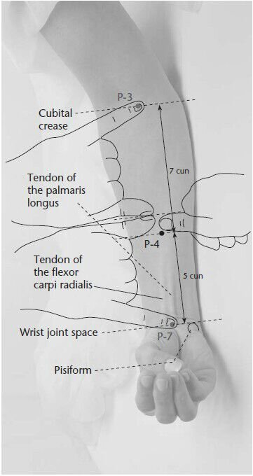Точка Си - Мэнь Р4 расположена глубоко в тканях, на 5 цуней выше лучезапястной складки.