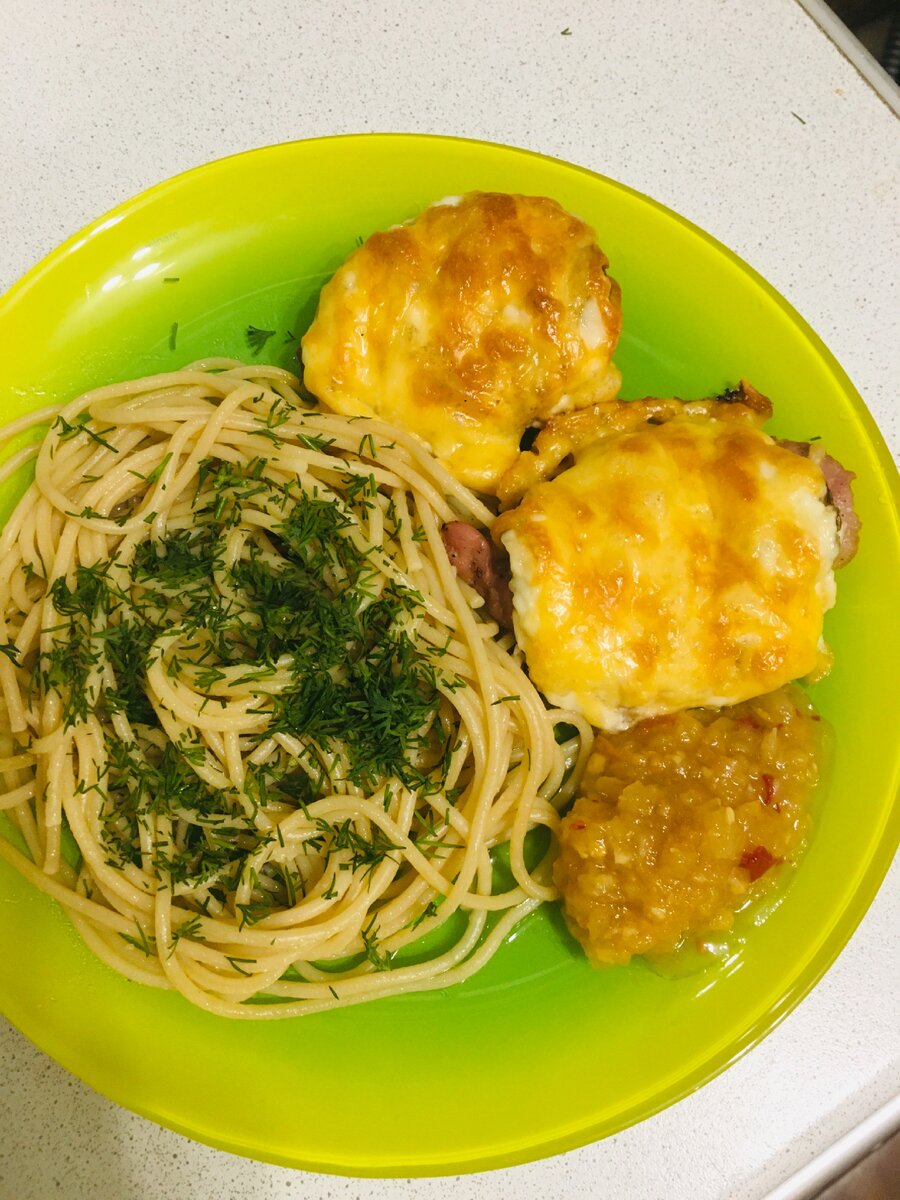 Сегодня у нас на ужин свиная отбивная под сыром и шампиньонами, для сына я пожарила немного наггетсов (не ест он мясо в духовке), на гарнир- спагетти, а к нему домашние салаты и зелень .