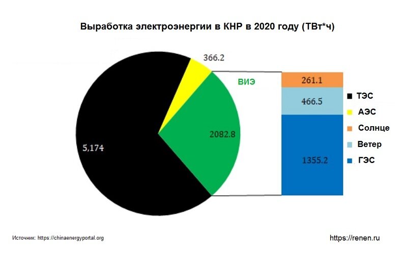 Ветровые и солнечные электростанции совместно выработали 727,6 ТВт*ч электроэнергии, почти на 100 ТВт*ч больше, чем в 2019 году. Для сравнения: это примерно 70% всей годовой выработки электроэнергии в России. Суммарная доля солнца и ветра в производстве электроэнергии в КНР достигла 9,54%.