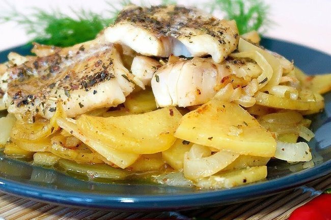Теперь картофель с рыбой нужно переложить в тарелки и подавать в горячем виде с укропом, а также каким-нибудь овощным салатом.