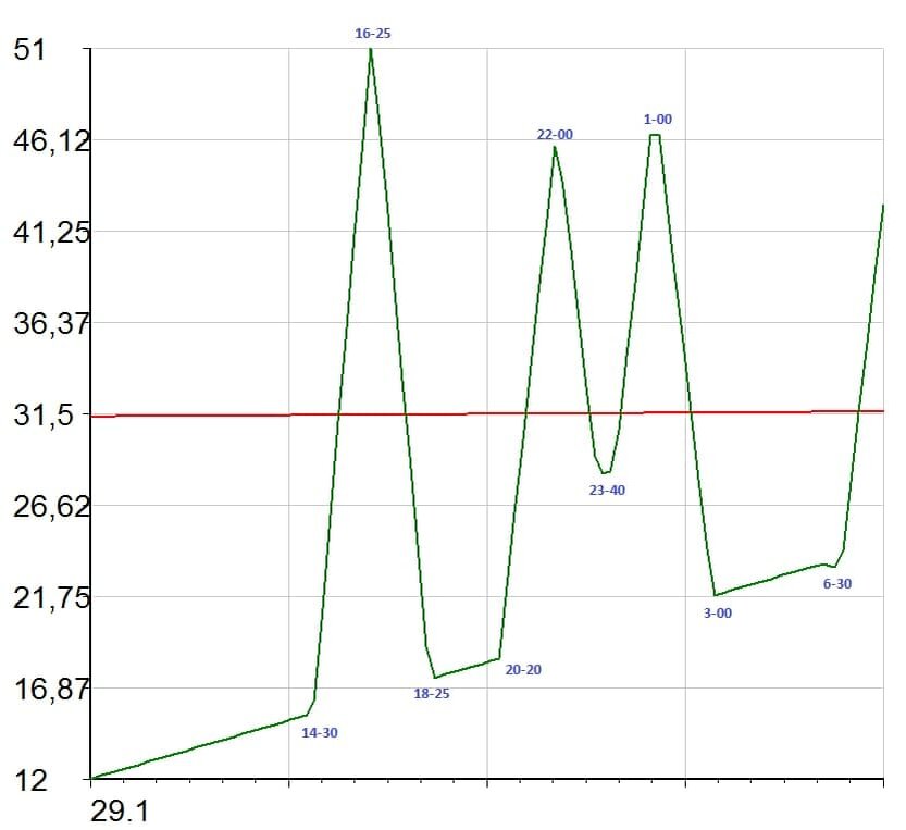 График движения цены ВТС в астрологической программе выглядит следующим образом: слева шкала силы импульса в баллах. красная линия-негативные аспекты, они снижают цену, зеленая линия-позитивные аспекты, они повышают цены. Какой аспект сильнее (по баллам) туда цена и идет. Указанное время Мск.(+3). Внимание! Время указанное на графике для ориентира, не