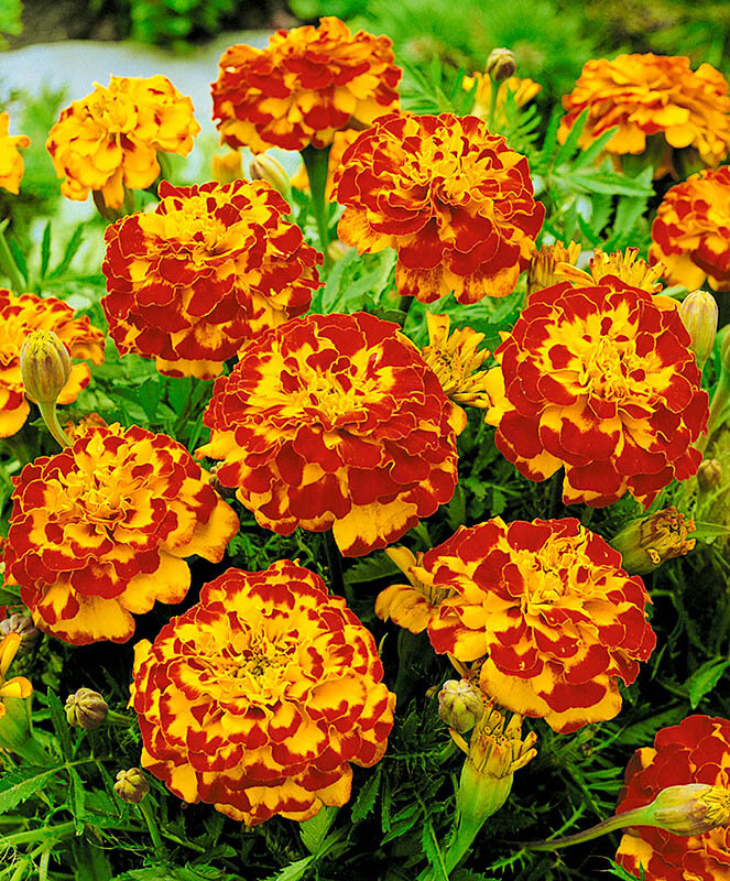Прекрасное сочетание с темно - зелеными хвойниками, с хостами. На бархатцах, все лето почти до заморозков, завязываются бутоны, раскрываются и отцветают, завязывая семена и все это происходит одновременно, а мы видим непрерывное их цветение.
