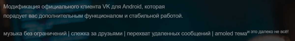 Этот клиент ВКонтакте удалён из Google Play из-за того, что даёт слушать и кешировать музыку без ограничений! Все аудиозаписи доступны, как в старых клиентах ВК, когда тот ещё не был куплен Mail.ru Group.
