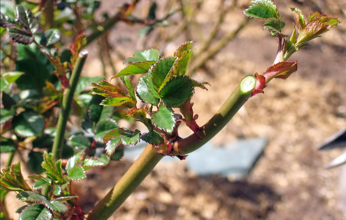 Первым делом следует освободить от земли место отрастания всех побегов. Сначала удаляют отмершие побеги, делая срез до здоровой ткани на спящую внешнюю почку. Срез делают на 2-3 см ниже повреждённого места. Если же на побеге не осталось ни одной живой почки, побег удаляют полностью до места прививки. Также обрезают дикую поросль — побеги, образующиеся ниже места прививки. Обрезают все слабые и деформированные побеги, а также побеги, растущие по направлению к центру куста. Из двух пересекающихся побегов удаляют более слабый.