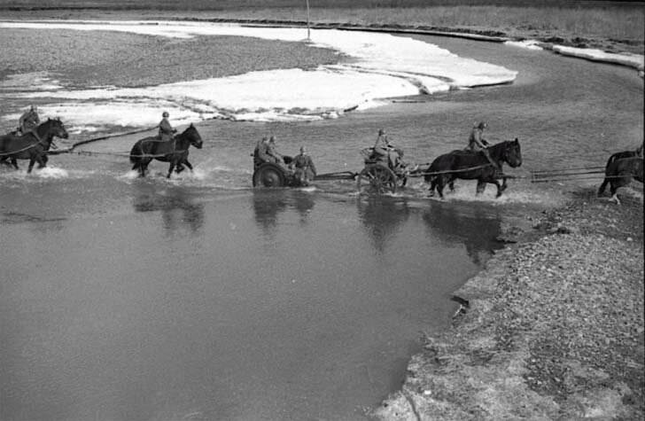 Soviet artillerymen (a team of 76-mm regimental gun model 1927), ferried across small river ford.