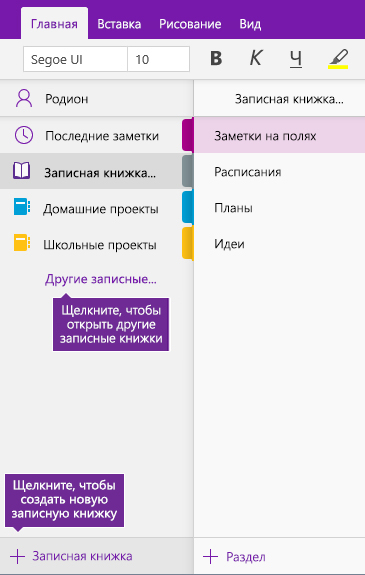 В OneNote вы в любое время можете добавить новые разделы в свою записную книжку. Разделам можно присваивать имена, которые помогут быстро получить представление о содержащихся в них страницах и связи с определенной темой.
