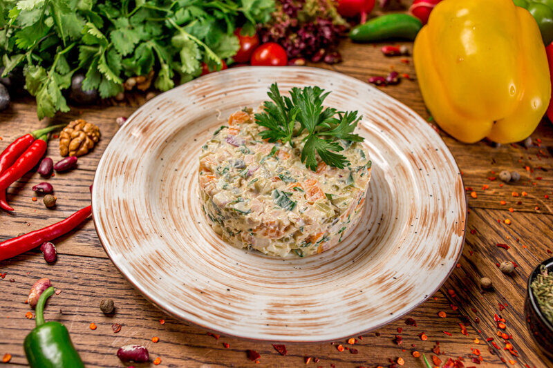 Чтобы салат был действительно похож на Жюльен, картофель и морковь следует нарезать маленькими кубиками, листья салата – тонкими полосками.