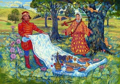 Возможно, скатерть-самобранка в русских сказках именно мечта об облегченной крестьянской жизни, где не надо с рассвета до заката работать в поле, копать, косить, молотить, молоть, а затем еще часами стоять у печи и все это только для того, чтобы получить каравай хлеба. И все-таки, народные сказания существуют для того, чтобы потомки смогли осознать глубинную суть человеческой жизни.