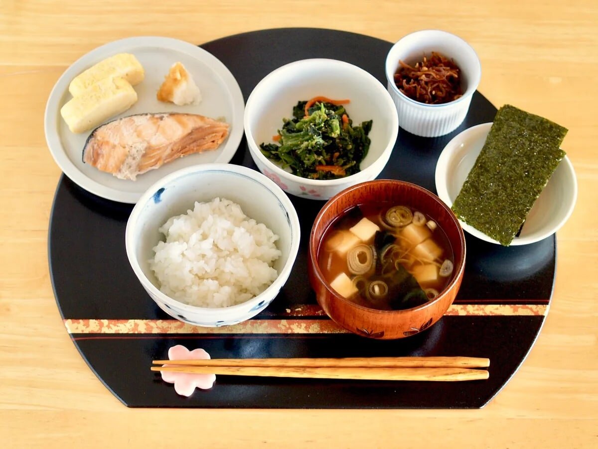 Они предпочитают более питательный завтрак, в него входят: рис, мисо-суп с луком и тофу, кусочек лосося и обязательно зеленый чай. С таким завтракогм ощущение сытости не пройдет до вечера.