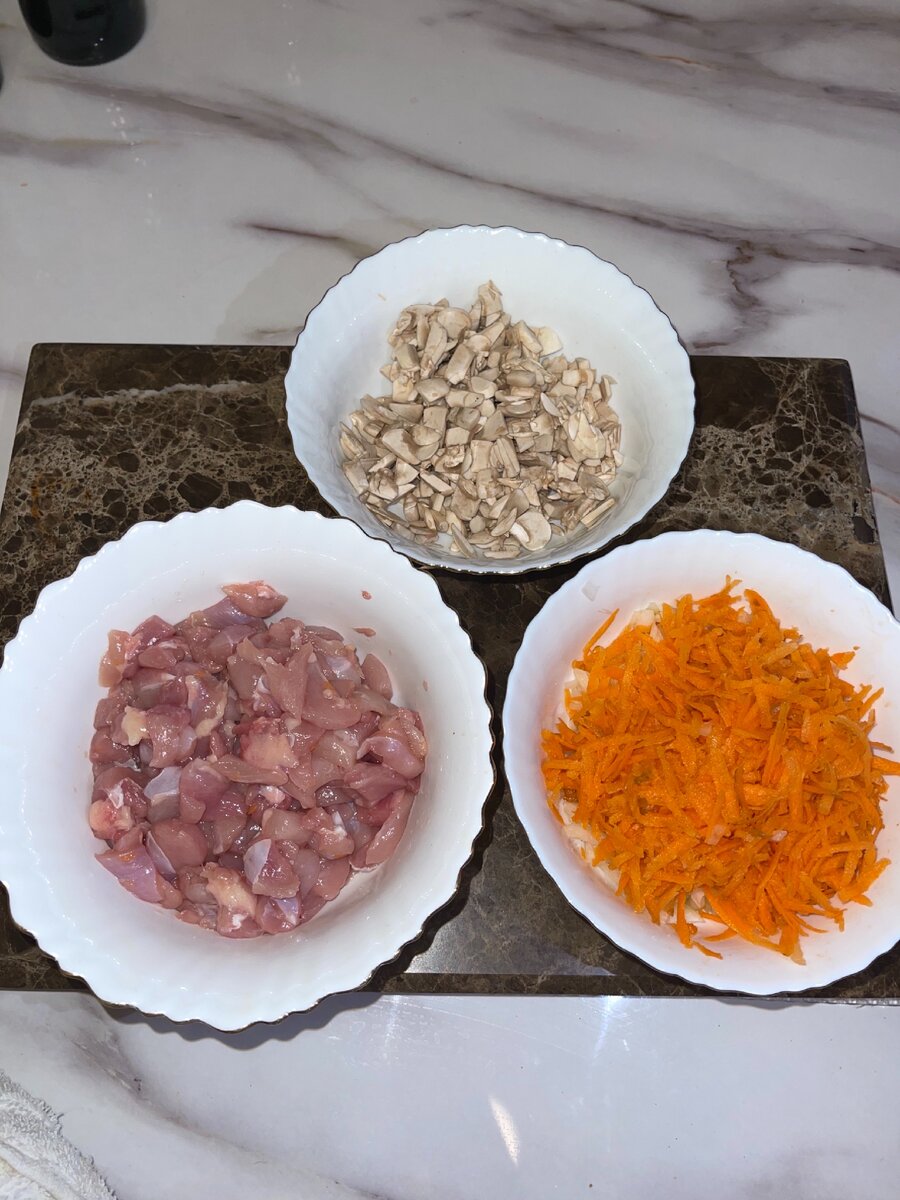Сперва ,мы обжариваем на сковороде, (сливочное +растительное масло ) куриное филе до золотистой корки, далее добавляем морковку и лучок ,и жарим это минут 7