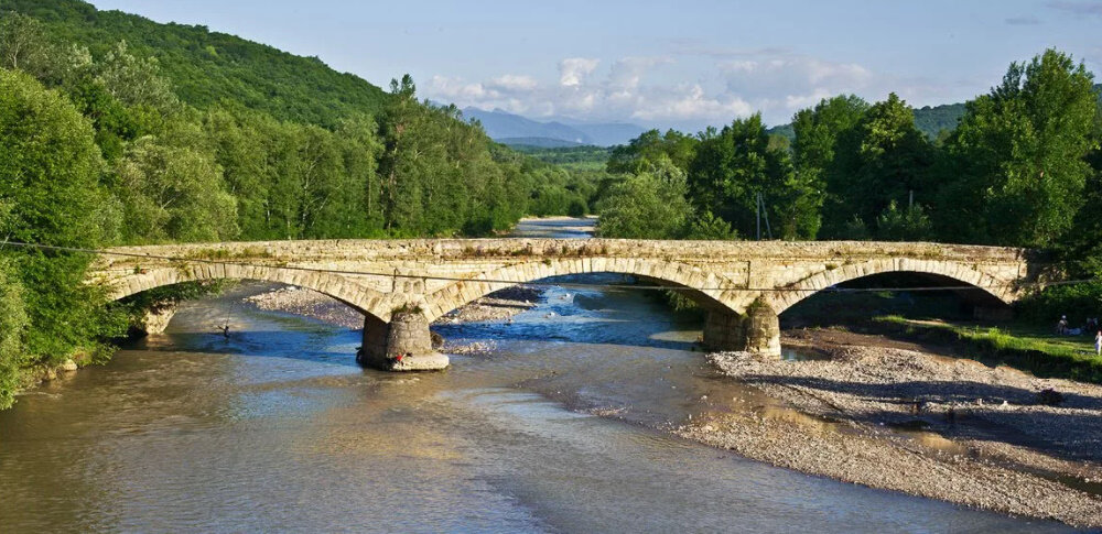 Если ехать на автомобиле от г. Майкоп в сторону лагонакского плато (в Лаго-наки), то, не доезжая пары километров до окраины станицы Даховская можно увидеть по правую сторону от автодороги старинный каменный мост через реку Дах.