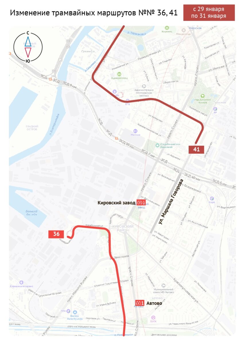 С 29 по 31 января, в связи с производством работ по прокладке канализации на Кронштадтской ул. у дома № 4, вносятся изменения в маршруты трамваев №№ 36, 41.