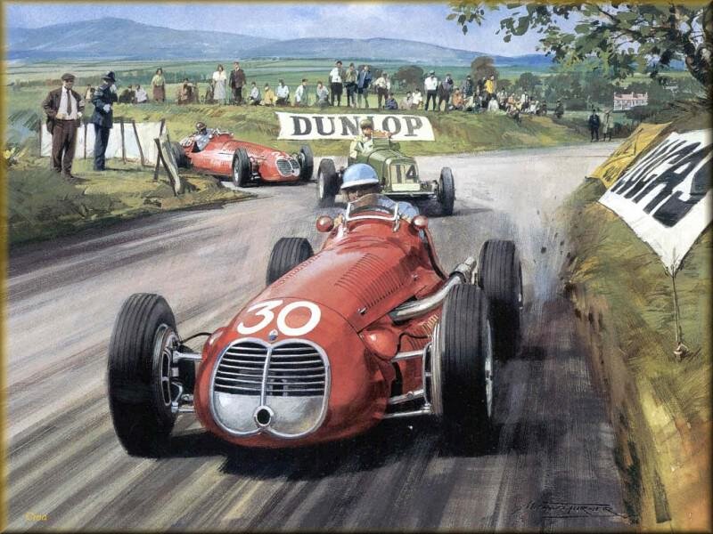 - 1951 Автомобили команды "Alfa-Romeo", имевшие в первом чемпионате мира ощутимое превосходство над соперниками, получили в сезоне-51 дальнейшее развитие в модели "159". Максимальная мощность достигла 430 л.с. при 9300 об/мин. Команда "Ferrari", проведя большую работу над своим Type 375,довела мощность мотора до 380 л.с. и составила миланской команде серьёзную конкуренцию. Литровая мощность на Alfa Romeo 159 составляла 287 л.с./л, а BRM – невероятные 352 л.с./л. Расход топливной смеси таких мощных двигателях был огромным – около 120 литров на 100 км –поэтому в каждой гонке необходимо было совершать остановки для дозаправки. Первые два этапа за победы боролись Фарина и Фанхио на "Alfetta", но начиная с Сильверстоуна победы стали доставаться и гонщикам на "Ferrari-375": Аскари и Гонсалесу. Перед последним, восьмым, этапом чемпионата лидировал Фанхио с 27 очками, но его преимущество над Аскари составляло только два очка. Третье место занимал Гонсалес - 21 очко. Последняя гонка чемпионата прошла в Испании на трассе Педралбес. Аскари выиграл квалификацию и со старта гонки вышел вперед, но уже после первого круга его нагнал стартовавший с четвертого места Фарина, а сзади накатывал Фанхио. Сначала он прошел Фарину, а затем и Аскари, который испытывал проблемы со слишком быстро разрушавшимися шинами. Фанхио одержал победу и выиграл чемпионат. Alfa-Romeo объявила об уходе из Формулы 1, в связи с переходом формулы на атмосферные моторы 2,0л. Это были последние классические гонки той эпохи , когда применялась стратегия регулярных пит-стопов для дозаправки, которая вернётся в формулу-1 лишь в 1982 году.