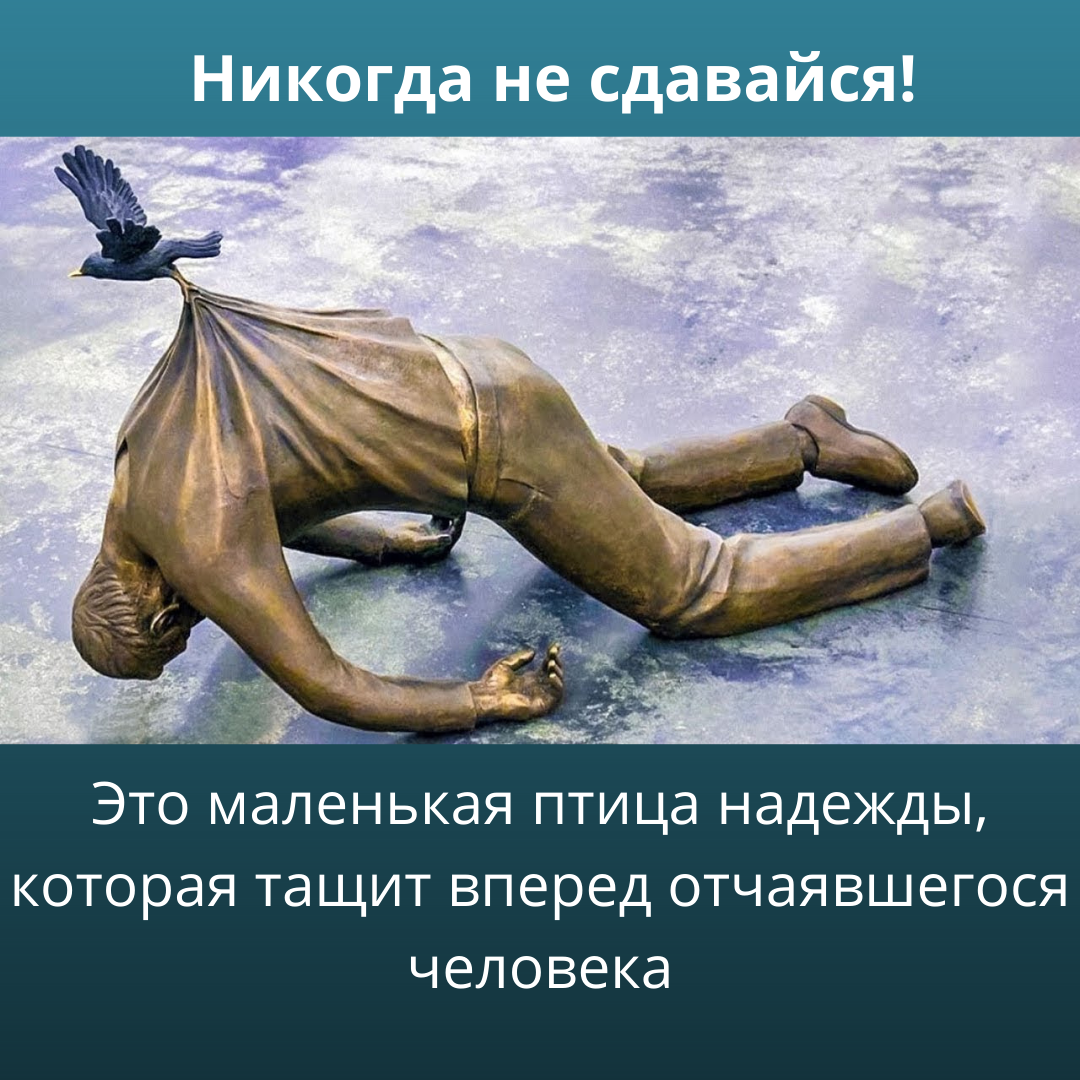 И это памятник не человеку, а маленькой птичке надежды, которая тащит вперёд отчаявшегося человека.