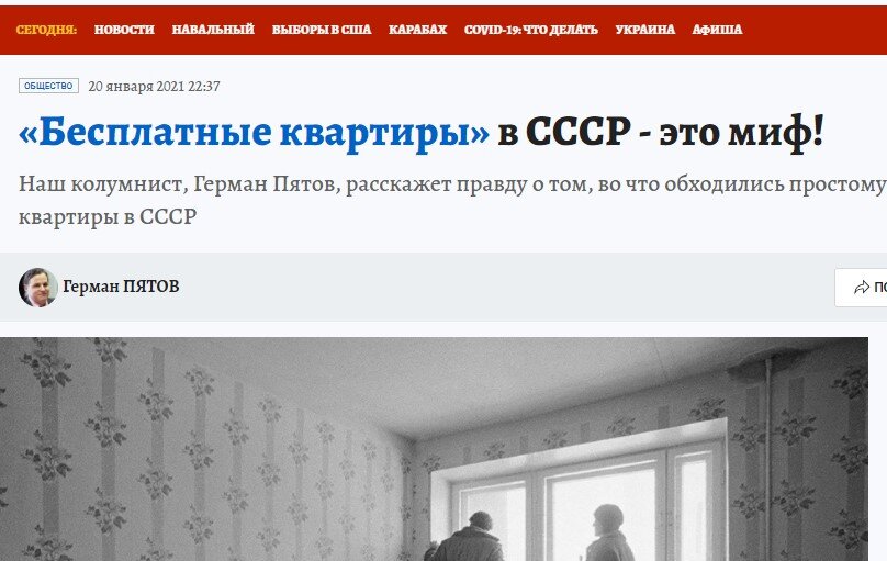 Итак, заголовок «Бесплатные квартиры» в СССР - это миф!»! Такой сенсационный заголовок не мог не привлечь моё внимание. Я занимаюсь исследованием жилищного вопроса, жилищно-коммунального хозяйства во второй половине XX века, поэтому любые статьи, связанные с данной темой меня очень интересуют. Автор, Герман Пятов, кандидат медицинских наук, вещает о том, что кругом был «блат», а простые работяги каторжно трудились чтобы когда-нибудь получить плохое жилье и т.д. И чуть что не так – в тюрьму. Кстати, у автора есть и другие «разгромные» статьи.