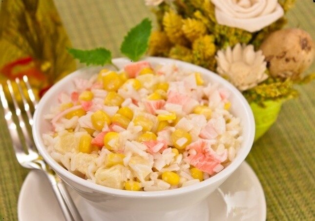 Небольшими кубиками нарезаем крабовые палочки и добавляем к кукурузе.