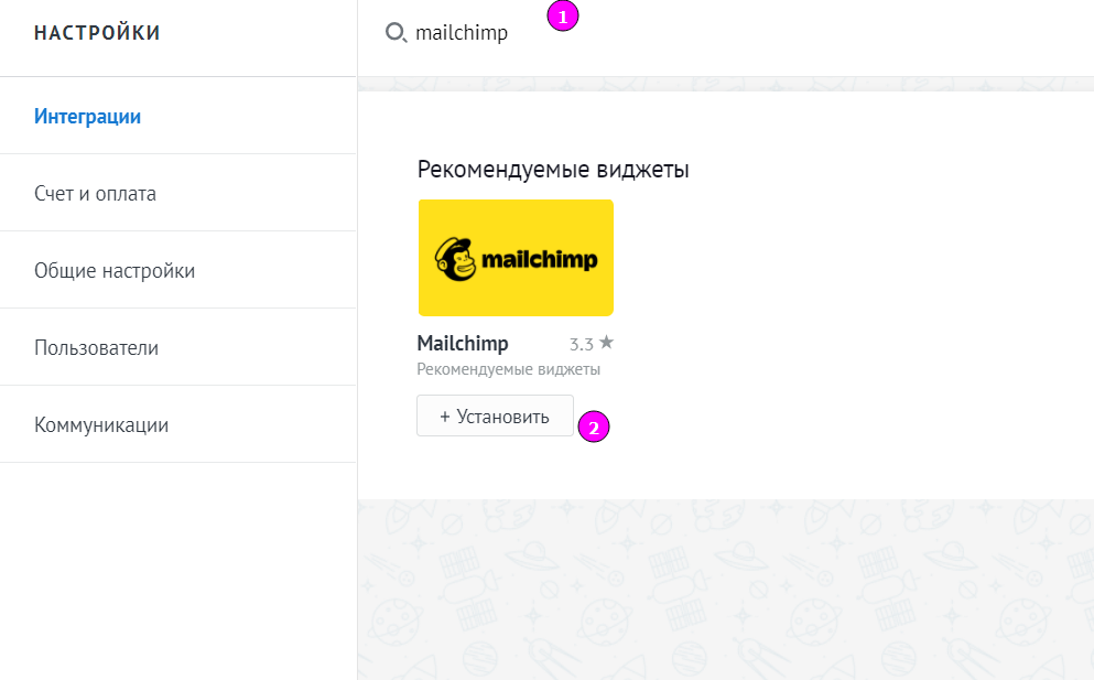 1. Зайдите в настройки, далее в интеграции и введите Mailchimp - сервис для email рассылок