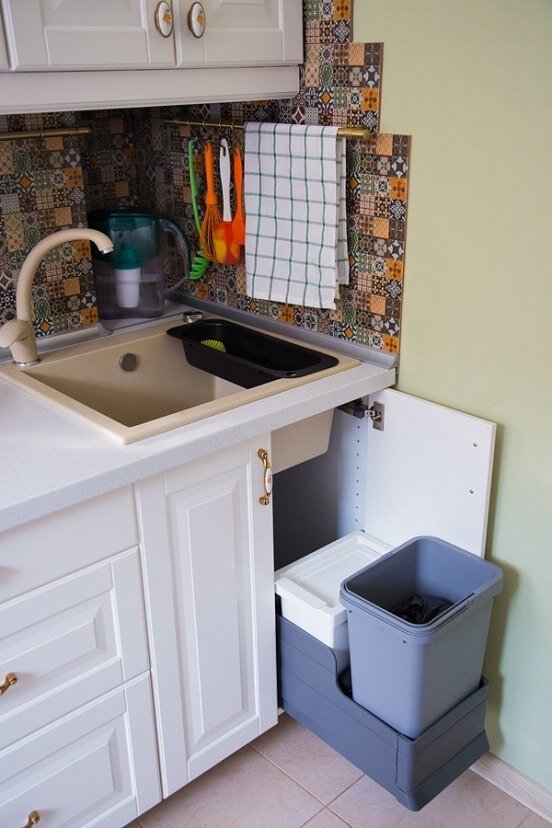 Гарнитур не стали делать углом, а предпочли начать его от стены. Там хозяева поставили раковину, а внизу рационально разместили контейнеры для мусора.