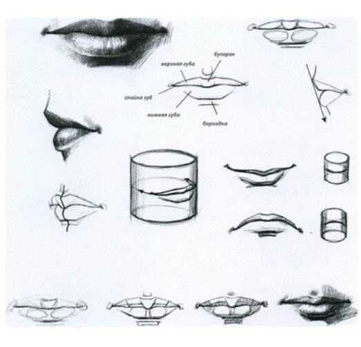 Расположение губ можно найти так. Если поделить высоту головы на 8 частей, то пятая линия вниз от макушки головы составит линию губ.