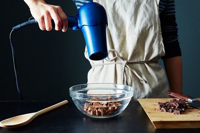 Водяная баня и микроволновая печь – отличные способы, проверенные временем, однако есть еще один метод, не менее эффективный. Все что вам нужно для того, чтобы довести шоколад до нужной консистенции – это стеклянная жаропрочная миска и фен. Разломайте плитку не небольшие кусочки, положите в тарелку и направьте на них фен, держа его на расстоянии 20-25 см. Время от времени меняйте направление потока воздуха и перемешивайте шоколадную массу лопаткой, чтобы она таяла более равномерно.