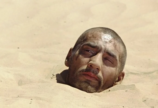 Тогда, по совету местных, сколотили из толстой фанеры ящик, в котором Мишулин мог поместиться по плечи стоя на коленях, а утром, обильно полив водой остывший за ночь песок, выкопали для этого ящика яму. Сделали для ящика крышку с отверстием для головы, которой накрывали ящик с актером, а потом небольшим слоем песка присыпали крышку сверху. В итоге, после нескольких дублей приняли решение отказаться от крышки, и в финальных дублях актера засыпали песком прямо в ящике.