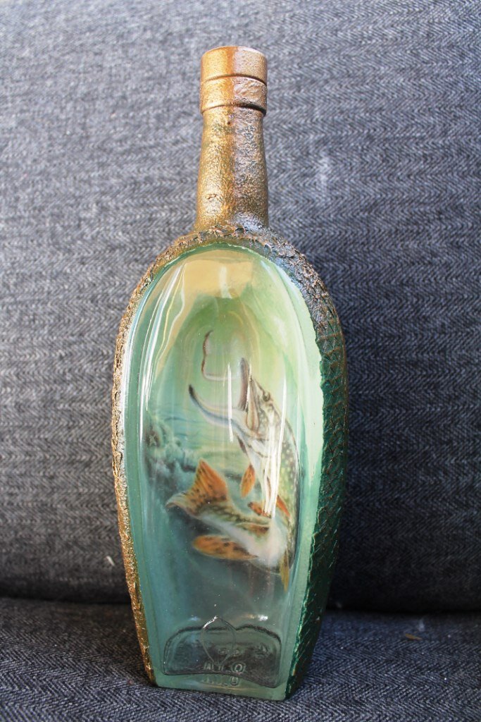 Выбирайте широкую бутылку, чтоб рисунок хорошо просматривался. Распечатайте подходящую картинку, желательно рыбы. Снимите с бутылки этикетки и обезжирьте её. Нанесите клей ПВА на то место, где будет
