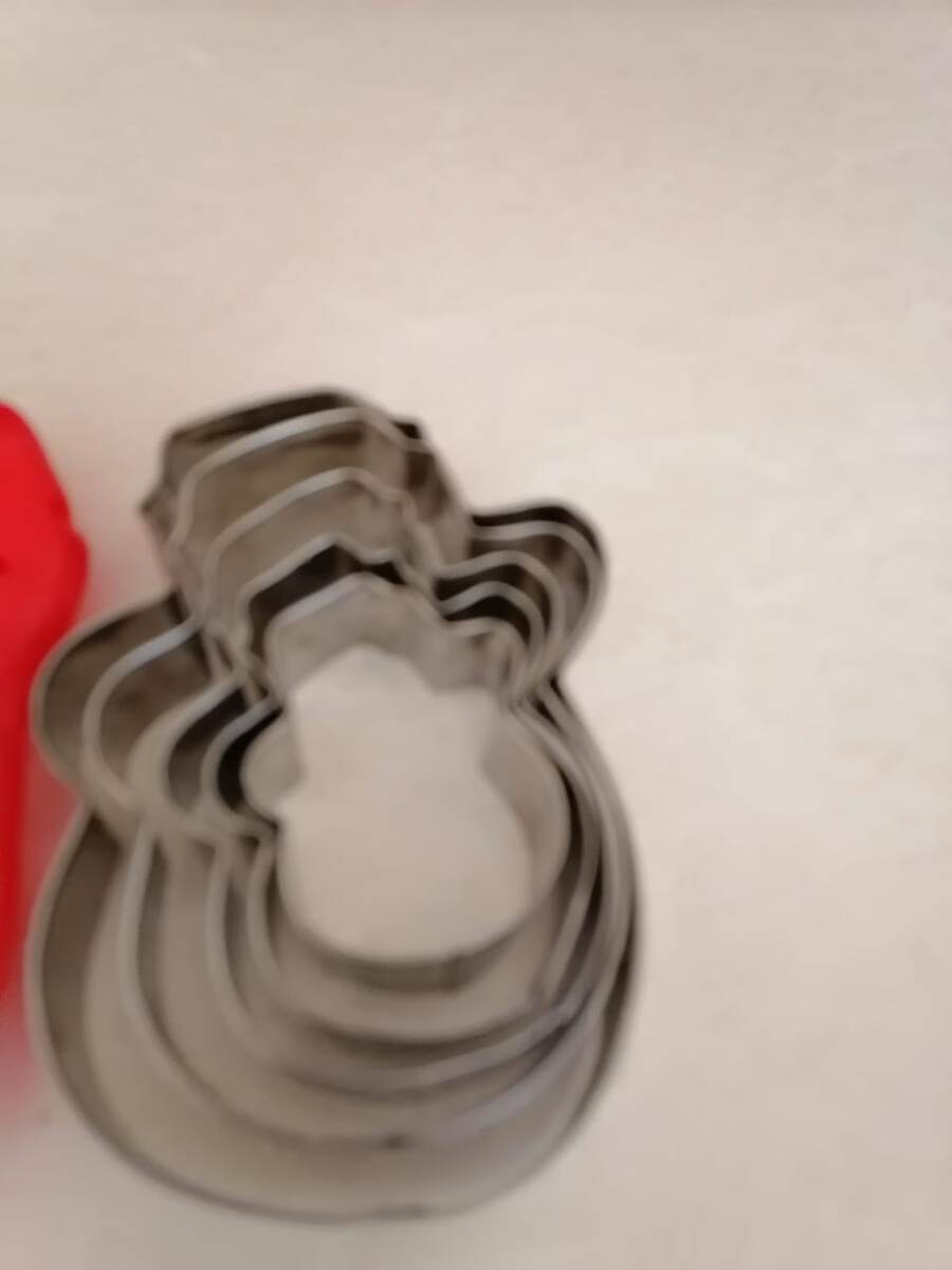 - Затем берем формочки( я использовала снежинку, снеговика, и домик) и вырезаем печенье.