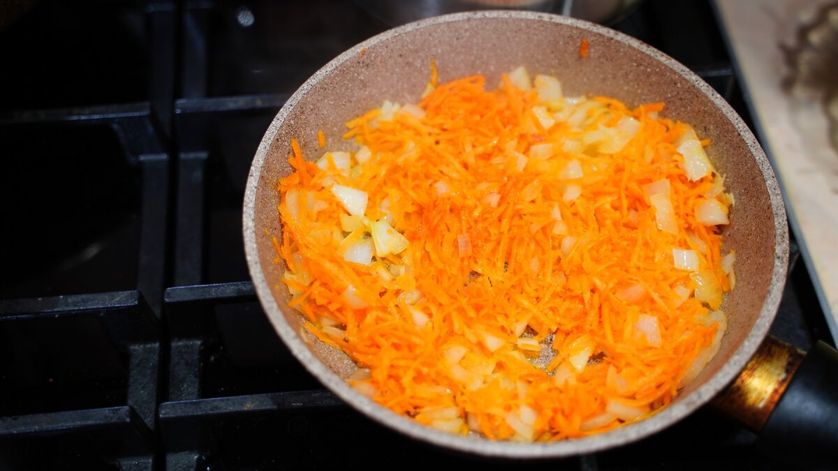 Для начала обжарим мелко нарезанный лук и морковь, натертую на мелкой терке.