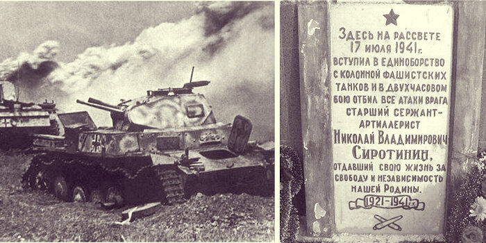Позже выяснилось, что это был командир орудия 137-й стрелковой дивизии 13-й армии старший сержант Николай Сиротинин. Он остался один прикрывать отход своей части. Сиротинин, занял выгодную огневую позицию, с которой хорошо просматривались шоссе, небольшая речушка и мост через неё. На рассвете 17 июля показались немецкие танки и бронетранспортеры. Когда головной танк вышел на мост, раздался орудийный выстрел. С первого выстрела Николай подбил немецкий танк. Второй снаряд поразил еще одну, замыкавшую колонну. На дороге образовалась пробка. Гитлеровцы попытались свернуть с шоссе, но несколько танков сразу застряли в болоте. А старший сержант Сиротинин продолжал посылать снаряды в цель. Противник обрушил огонь всех танков и пулемётов на одинокое орудие. С запада подошла вторая группа танков и также открыла стрельбу.