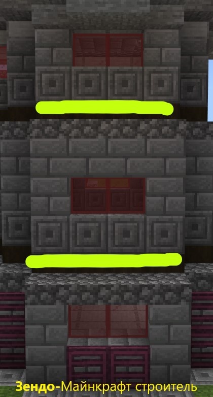 Сначало разделяем всё на 3 этажа верхними полублоками. 1 этаж украшаем первым, для него отделные вещи для строительства.