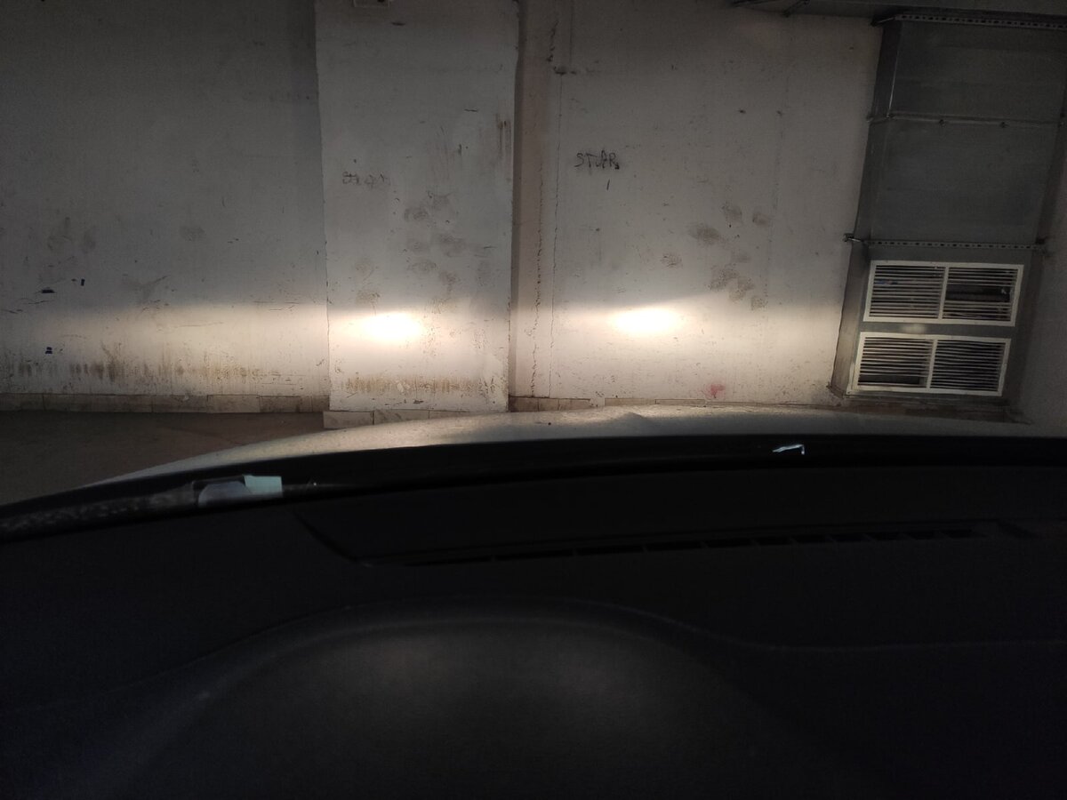 Так как автомобиль современный, так ещё и VAG , напряжение на лампах поднимается компьютером, выставляется до 13.7, при этом в темном гараже видно, как значительно расширяется освещение обочины и улучшается заливка.