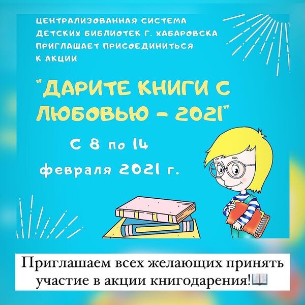 С 8 по 14 февраля 2021 года Ассоциация деятелей культуры, искусства и просвещения по приобщению детей к чтению «Растим читателя» при поддержке Российской государственной детской библиотеки проводит Пятую общероссийскую акцию «Дарите книги с любовью», приуроченную к Международному дню книгодарения, который отмечается 14 февраля во многих странах мира.