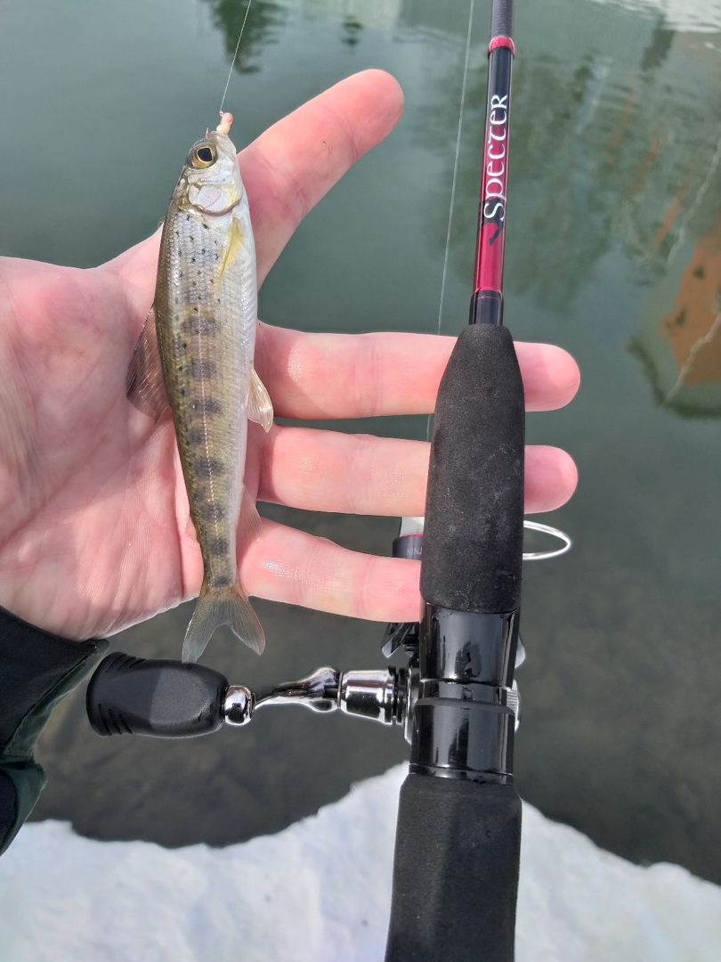 Как оказалось, на берегу я был не один, кроме подтянувшегося товарища здесь уже во всю размахивал поплавочной удочкой один дед. Как выяснилось, он ничего не поймал. На самом деле это не мудрено, ведь он ловил на здоровенного червя, толщиною с мой мизинец и внушающей длинной. Такого червя рыба сходу не съест, по этому надо долго ждать, когда она зажует или просто менять приманку на более мелкую. Я быстро собираю спиннинг, привязываю мормышку, одеваю опарыша. Ранье я не задумывался над тем, как надеть опарыша на крючок, сейчас все чаще надеваю его поперек. Таким образом приманка обладает большей парусностью, медленнее тонет и становится более привлекательной для рыбы. Делаю заброс в самую струю и даю течению снести мормышку вниз и максимально ее заглубить. Аккуратная игра кончиком удилища сочетается с крайне медленной работой катушки, все нацеленно на то, что бы провести приманку как можно ближе ко дну. Приманку ты и не видишь, но все равно можно понять где она сейчас находится, в данном случае она вылетела из основного потока и ее несет обратным течением в мою сторону. В такой ситуации мормышка может проходить на максимально низком горизонте и в какой-то момент ее сносит дальше и проводка получается чуто против течения, это приходится ближе к выходу из ямы. Траектория напоминает латинскую букву S. На середине обратки, в самой глубине на крючок что-то подвисло без четкой поклевки. Делаю подсечку, на крючне рыба и сопротивляется она как-то резво для ельца, так, что спиннинг прогнулся. Тонко настроенный фрикцион скрипит, но рыба неспешно подходит к берегу, где становится ясно, что попался неплохой хариус. Поклевка для хариуса не типичная, обычно они мощные, где сила рыбы дополняется силой течения. Очень приятная и красивая рыба, но забирать ее я не стал, ведь у нее было большое брюхо, наверняка готовится оставить потомство. Нет, она должна жить и дать жизнь другим. По этому стараюсь фотографироваться как можно быстрее. К слову о фотографиях, это фиаско. Фотограф, к сожалению не впечатлил.