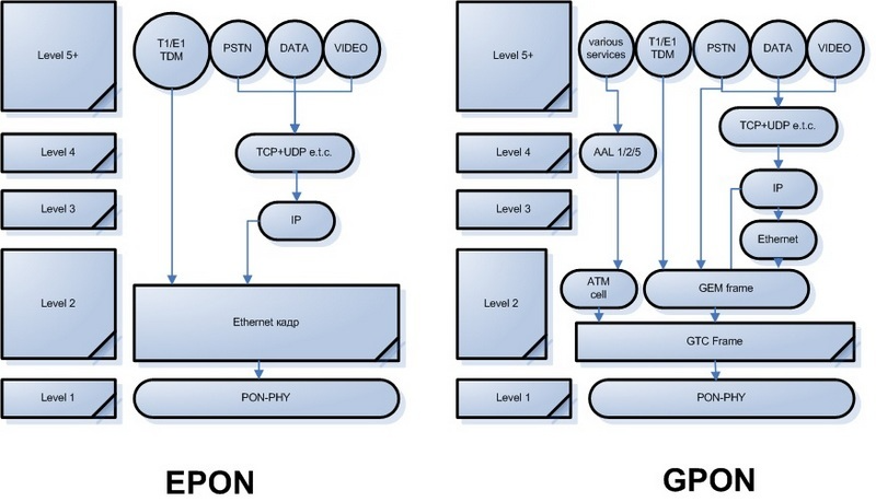 Основные отличия GPON от GEPON заключаются в большей полосе нисходящего потока (DownStream, DS) у GPON: 2.5G против 1.25G у GEPON. А также, отличающейся структурой кадров: в GEPON она максимально похожа на Ethernet, а у GPON более сложная, и больше напоминает SDH.