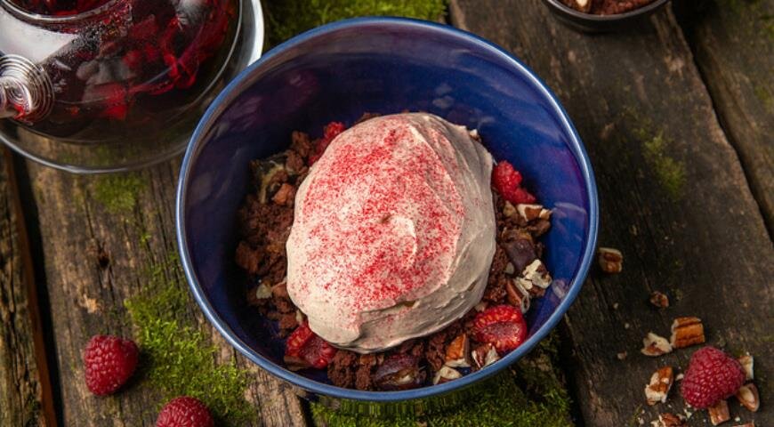 4. Собирать десерт. В каждую тарелку горкой разложить шоколадный бисквит, сверху в произвольной форме разложить малину, финики и измельченный на небольшие кусочки орех пекан. Добавить пюре малины, сверху ложкой положить сметанный крем