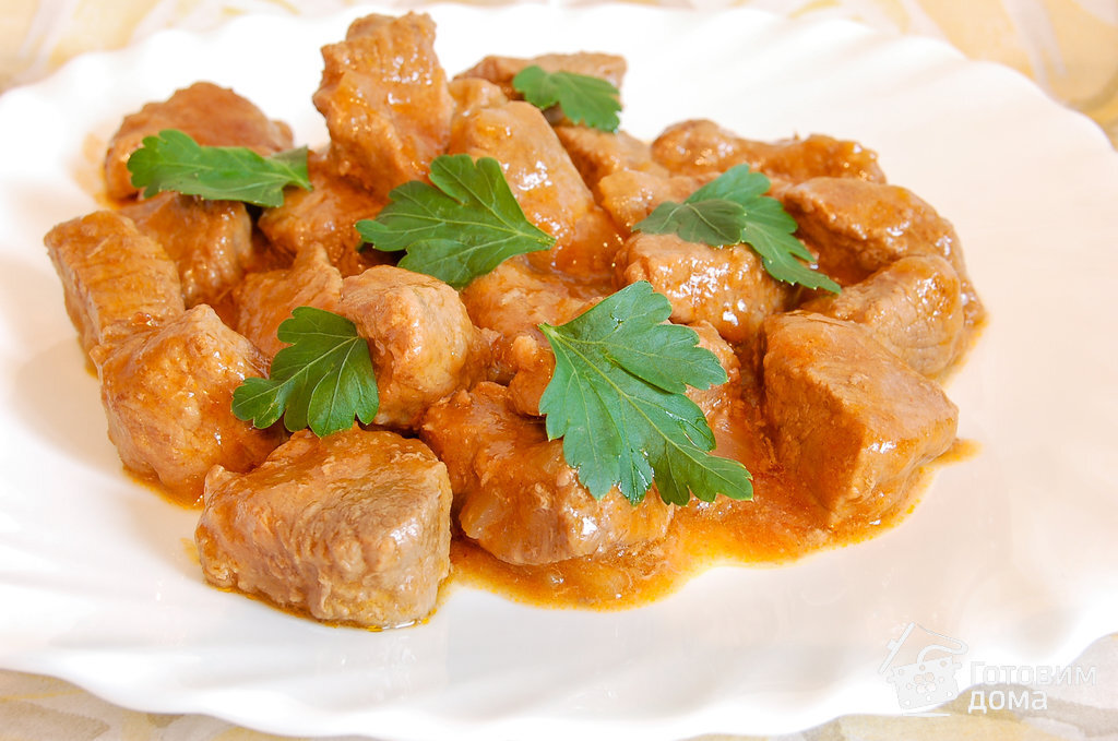 8. Перемешиваем и варим гуляш еще 20 минут или до мягкости картофеля. В готовое блюдо добавляем сметану по желанию и посыпаем свежей петрушкой.