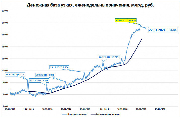 На 22 января узкая денежная база* составила 13,6 трлн. рублей.
