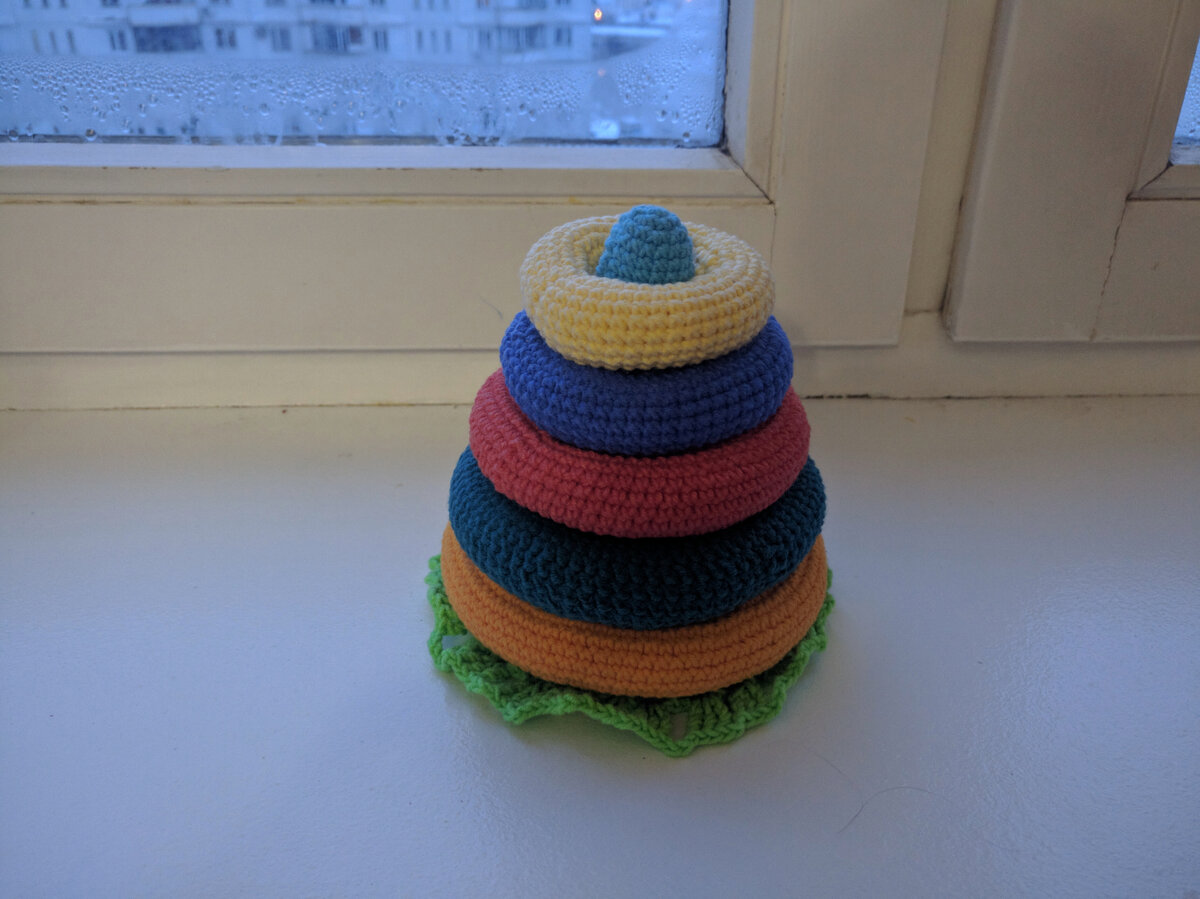 Связалась у меня для сына вот такая пирамидка. Очень легко делается. Экологическая и практичная. Можно не только научиться собирать пирамидку, а и почесать зубки и погрызть. Одни плюсы и делается быстро.
