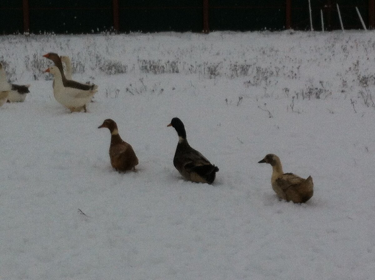 У нас в этом году зимуют две семьи кур во главе с петухом в каждой, две утки и селезень и семья гусей.