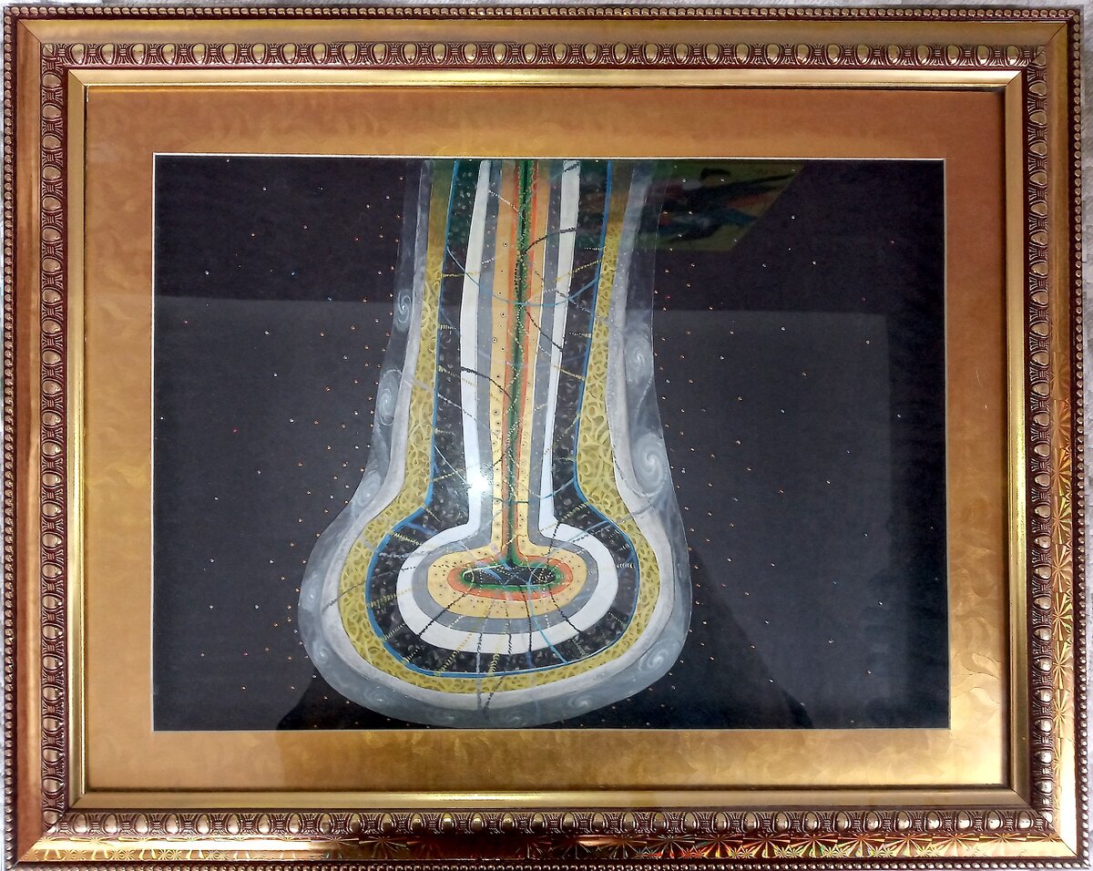Как видно из общей структуры картины (приведенной на заставке к данной статье и всему каналу), на ней изображены вложенные друг в друга слои. Конфигурация слоев одинакова и напоминает некий незамкнутый сосуд с длинным горлышком.