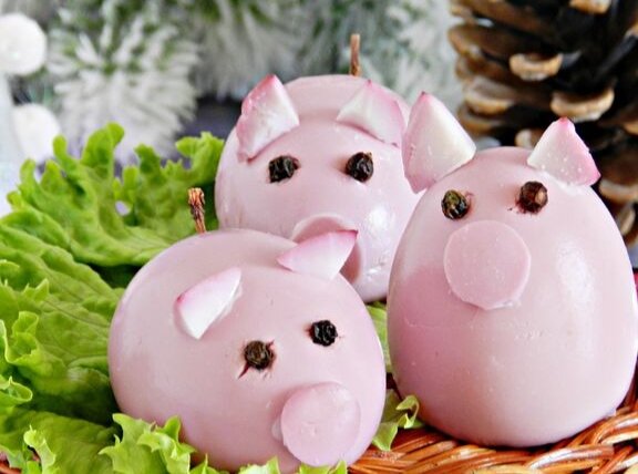 Для украшения можно приготовить закуску в виде забавных поросят из отварных куриных яиц.