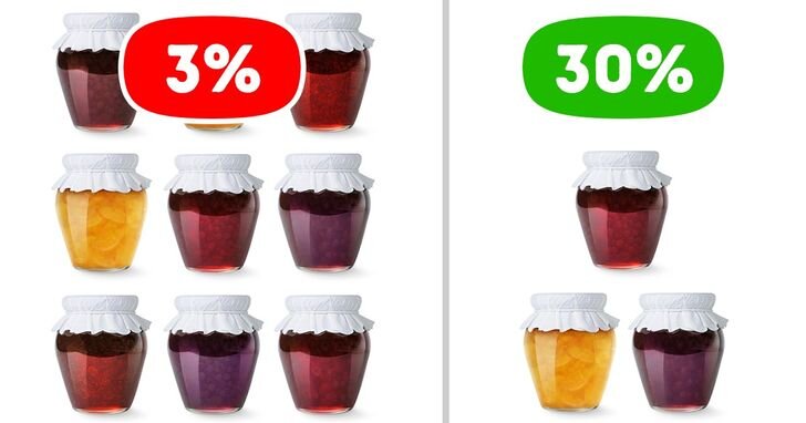 Удивительно, но люди предпочитают иметь меньше вариантов, чем иметь больше возможностей. Когда есть много вариантов на выбор, способность принимать решения парализована. Это явление было доказано экспериментом "джем". Когда им подарили много банок варенья, только 3% покупателей сделали покупку. Когда количество вариантов было ограничено, 30% клиентов что-то покупали.