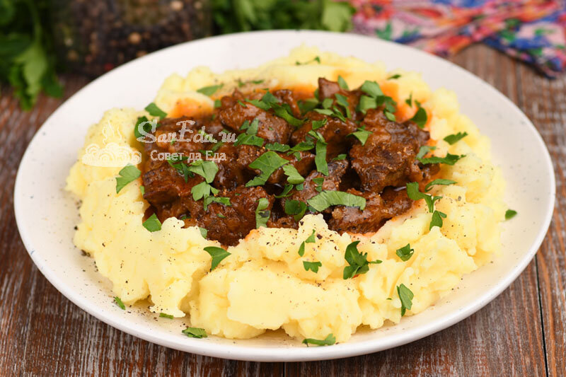 Очень люблю это блюдо за вкус, который знаком с детства, простоту в приготовлении и множество вариантов. К гуляшу с подливкой подходит любой гарнир из круп, бобовых, овощей и макаронных изделий. Мне нравится его подавать с картофельным пюре. По такому принципу готовлю гуляш со свининой, птицей или говядиной.