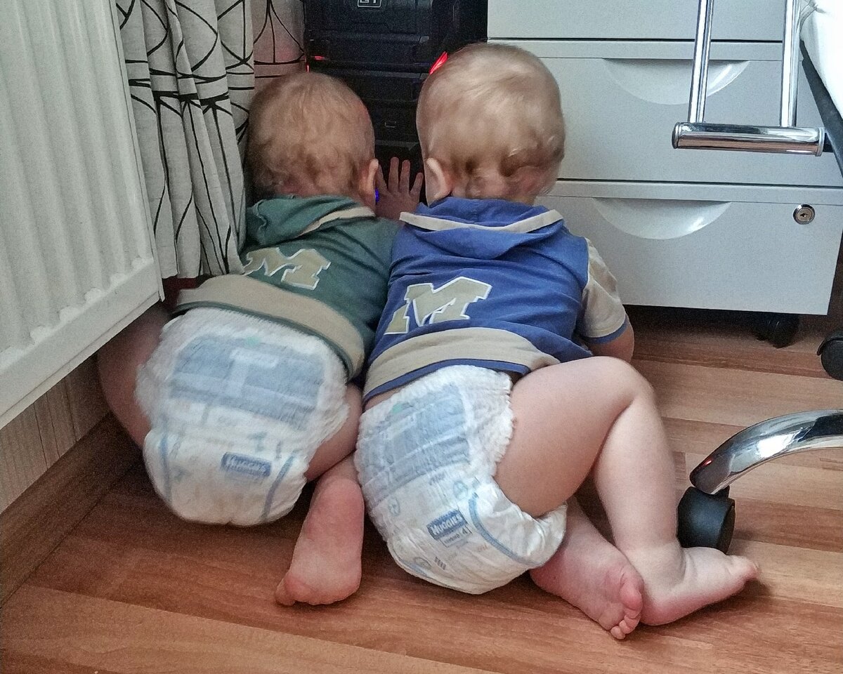 Сейчас двойняшкам год, и каждый день на пару они придумывают всякие игры. С ними уже намного интереснее проводить время. Иногда прям настолько весело, что ты теряешься в догадках и не знаешь, что делать.