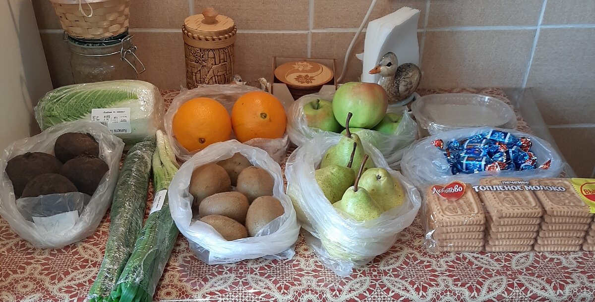 Покупки делали в двух магазинах "Поляна" и "Мясная лавка" в два дня, так как тяжело носить и особенно поднимать на пятый этаж.