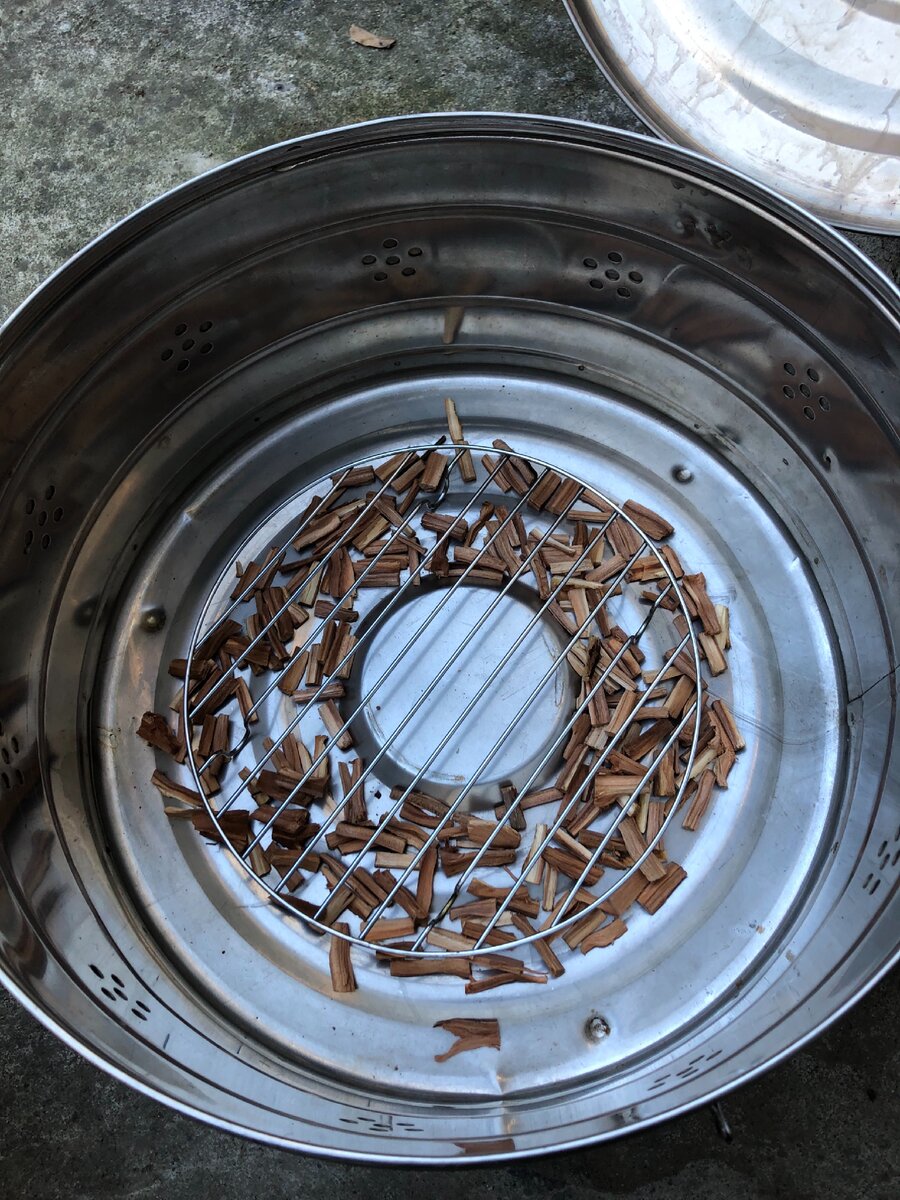 На дно БИКСа выкладываем буквально одну горсть щепы. Ставим подставку (низкую решётку) для подноса который будет выполнять функцию жироулавливателя. Сразу «лайфхак»: если не хотите возиться с пригоревшими каплями жира, постелите на поднос фольгу. После копоти фольгу с каплями жира просто выбросить, а поддон (поднос) останется чистым.